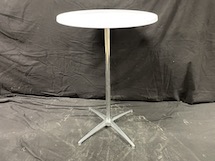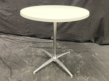 Delbart ståbord med vit skiva och kromad benställning.
