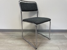 Klassisk stol i grå klädsel med kromad benställning.